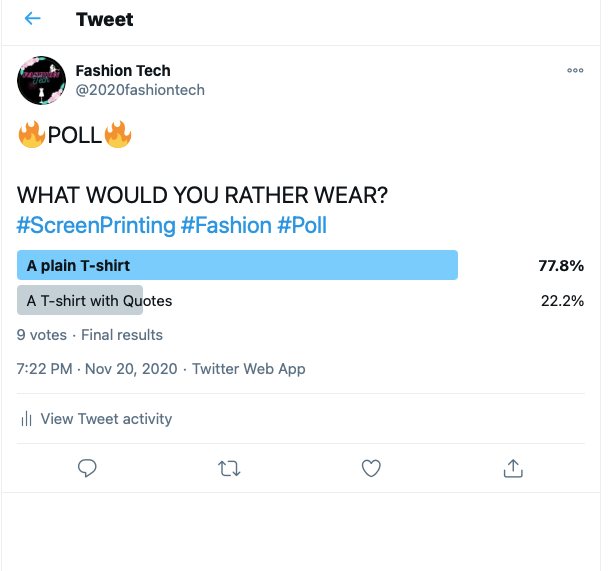 Polls successfully reached a large number of people through hashtags and 9 votes were received in the Poll below. The context of this Poll relates to my blog because it encourages viewers to check out my 'Screen-Printing' blog post. Twitter is the best Social Media platform for Polls to work successfully. This is because Polls on Instagram can only be added to Stories- which usually only reaches the accounts who already follow you.
